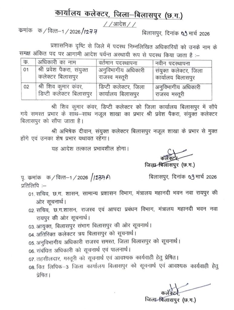 इन अधिकारियों के बदले प्रभार में श्री प्रवेश पैकरा (संयुक्त कलेक्टर) इन्हें अनुविभागीय अधिकारी (राजस्व) मस्तुरी से हटाकर जिला कार्यालय बिलासपुर में संयुक्त कलेक्टर के पद पर पदस्थ किया गया है। साथ ही इन्हें नजूल शाखा का प्रभार भी सौंपा गया है।