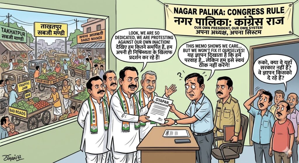 तखतपुर के सब्जी बाजार में आए दिन जाम लगा रहता है, जनता परेशान है, लेकिन समाधान निकालने के बजाय कांग्रेस के दिग्गज हाथ में कागज थामे फोटो खिंचवा रहे हैं। खास बात ये है कि ज्ञापन उन्हें ही दिया जा रहा है जिनके कामकाज की जिम्मेदारी खुद कांग्रेस की है। शायद इसे ही कहते हैं ‘सेल्फ-अटैस्टेड राजनीति’ अपनी ही नाकामी को ज्ञापन का जामा पहनाकर नगर पालिका के जनप्रतिनिधियों ने साबित कर दिया है कि वह विपक्ष की भूमिका निभाने के इतने शौकीन हैं कि सत्ता में रहकर भी खुद के खिलाफ प्रदर्शन करना नहीं भूलते